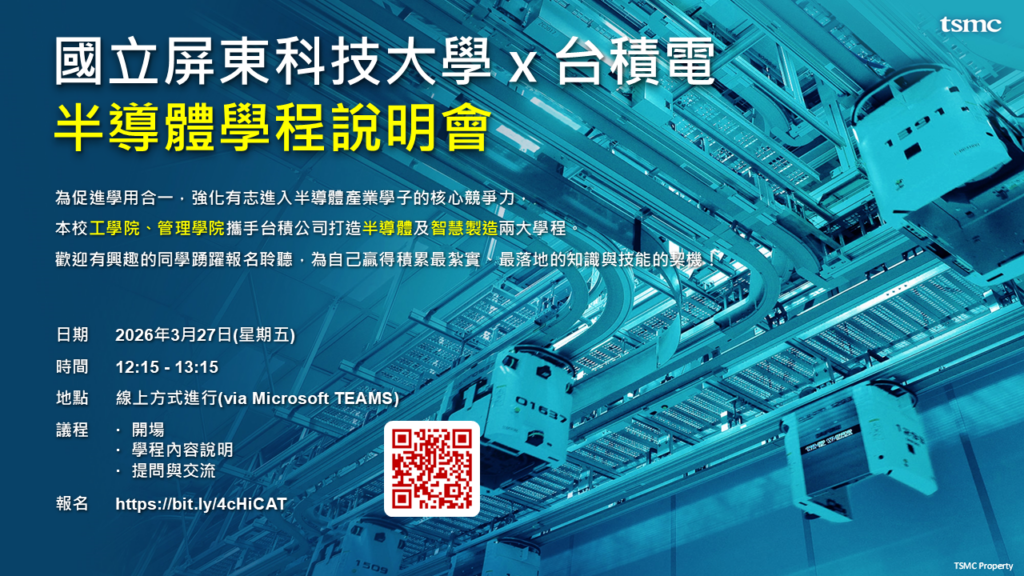 工學院與台積電共同合作開設【半導體學分學程】,以培育具有半導體製程實作及就業力之優質專業人才。